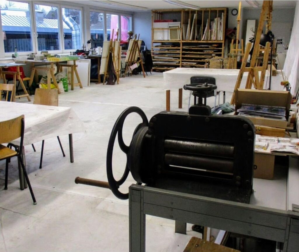 Das Atelier dieKunststation ist ein großzügiger, lichtdurchfluteter Arbeitsraum mit professioneller Ausstattung: Staffeleien, Druckpresse, große Arbeitstische, vielfältige Materialien und viel Platz für kreatives Arbeiten in entspannter Atmosphäre.